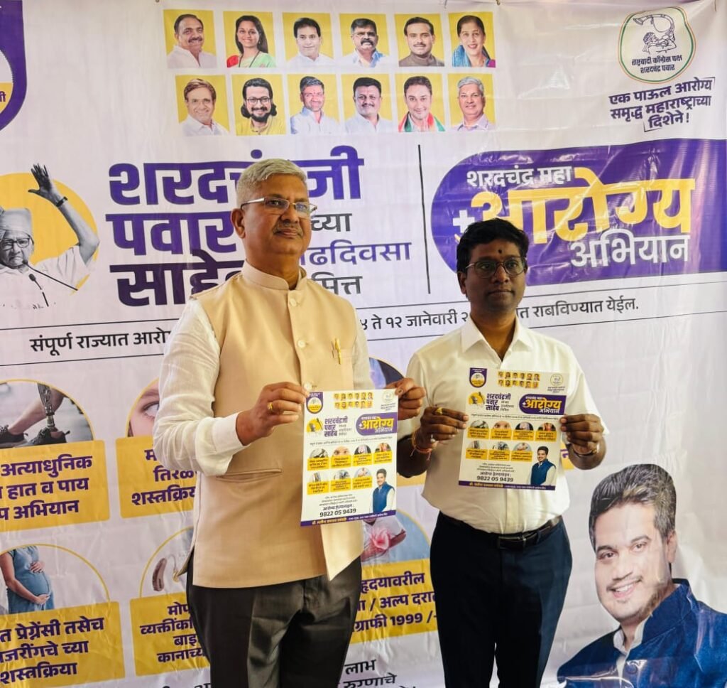 पुणे, ता. ११ : भारताचे माजी संरक्षणमंत्री व कृषिमंत्री तसेच महाराष्ट्र राज्याचे माजी मुख्यमंत्री, पद्मविभुषण मा. शरदचंद्रजी पवार साहेब १२ डिसेंबर हा ८४ वा वाढदिवस संपन्न होऊन ८५ व्या वर्षात पदार्पण करत आहेत. त्या निमीत्त शरद पवार संजीवनी आरोग्य मित्र व डॉक्टर सेल यांच्या माध्यमातून राज्यभरात ”शरदचंद्र महा आरोग्य अभियान” राबविण्यात येत आहे.