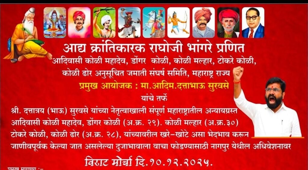 पुणे: दि. ११ नोव्हेंबर २०२५ रोजी ‘आद्य क्रांतिकारक राघोजी भांगरे प्रणित आदिवासी कोळी महादेव, डोंगर कोळी, कोळी मल्हार, टोकरे कोळी, कोळी ढोर जमातीची संघर्ष समिती’ने जात वैधता प्रमाणपत्रांसाठी होत असलेल्या भेदभावाविरोधात आदिवासी संशोधन व प्रशिक्षण संस्था (TRTI), पुणे यांच्या कार्यालयावर भव्य पदयात्रा मोर्चा आणि दिवसभर धरणे आंदोलन केले. विस्तारित क्षेत्रातील (OTSP) ६३ लाख कोळी बांधवांवर होत असलेल्या अन्यायाला वाचा फोडण्यासाठी हा एल्गार पुकारण्यात आला.